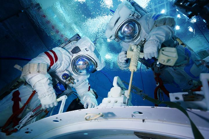 神舟十六号航天员朱杨柱(右)、桂海潮进行水下训练。新华社发(徐部 摄)